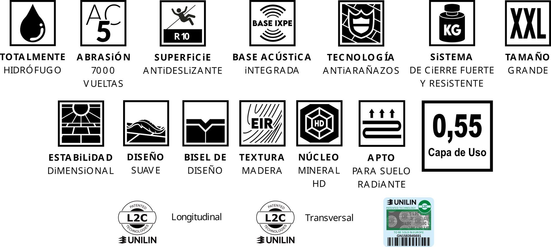| Resistencia a la abrasión | EN 13329 EN 16511-2014+A1-2019 | AC5 - ≥ 7000 - Capa de uso 0,55 mm |